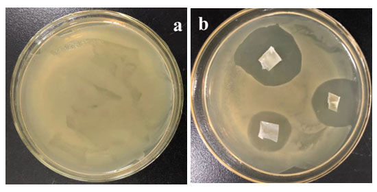 圖1. 培養(yǎng)基培養(yǎng)24小時(shí)后抗菌水管抑菌圈測(cè)試效果圖(a:對(duì)照樣;b:放置抗菌水管片樣)