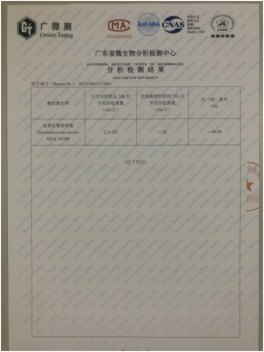 圖2是委托具備CMA、CNAS等資質(zhì)的廣東省微生物分析檢測(cè)中心檢測(cè),依據(jù)JC/T939-2004標(biāo)準(zhǔn)測(cè)試其抗菌性能得到的測(cè)試結(jié)果。測(cè)試結(jié)果表明,經(jīng)24小時(shí)后,抗細(xì)菌塑料管樣抗菌率達(dá)到99.99%以上,說明我們的抗菌水管具備優(yōu)良的抗細(xì)菌性能。